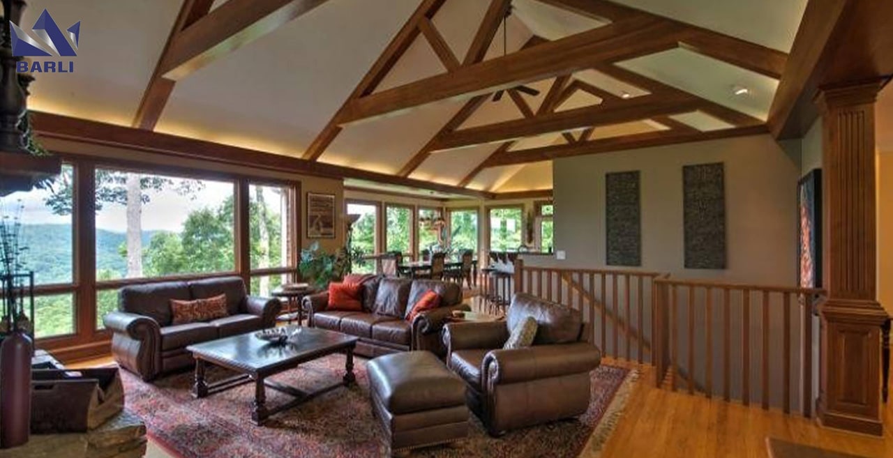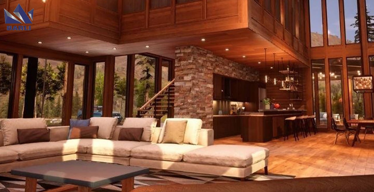 در فضاهایی که از نور طبیعی کافی برخوردار هستند، بهویژه در خانههای ویلایی با پنجرههای بزرگ و بازشو، استفاده از ترکیب رنگ چوب خانه ویلایی به صورت روشن و تیره، باعث ایجاد عمق بصری و پویایی در محیط میشود. برای مثال، کفپوشهای چوبی تیره در کنار سقفهایی با تیرهای چوب روشن، ترکیبی گرم، متعادل و چشمنواز بهوجود میآورند.